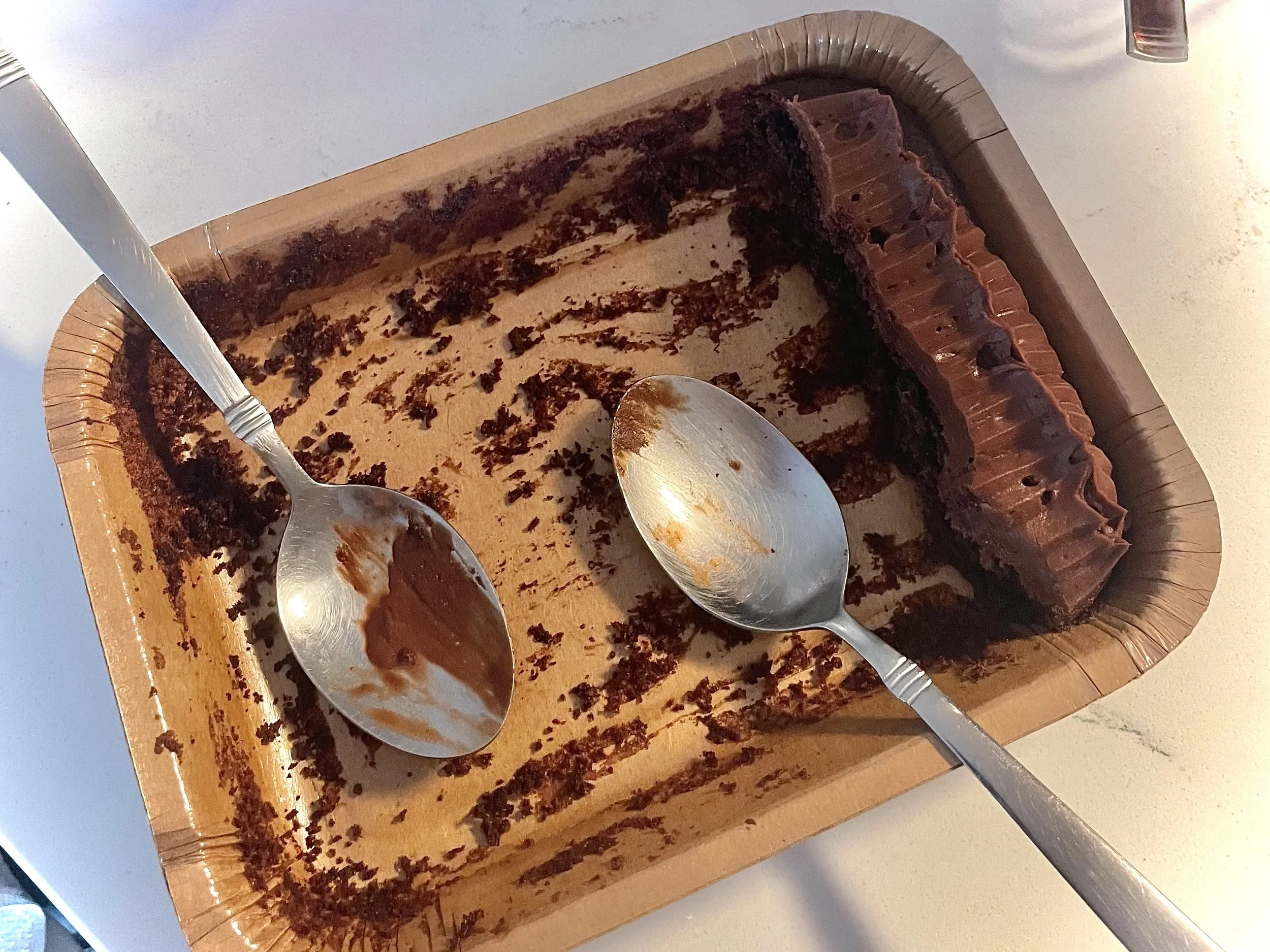 Whatever happened between leaving Trader Joe’s and eating that cake is just the space between because all thoughts and feelings came to a halt once having a spoon full of that dark chocolate sheet cake.